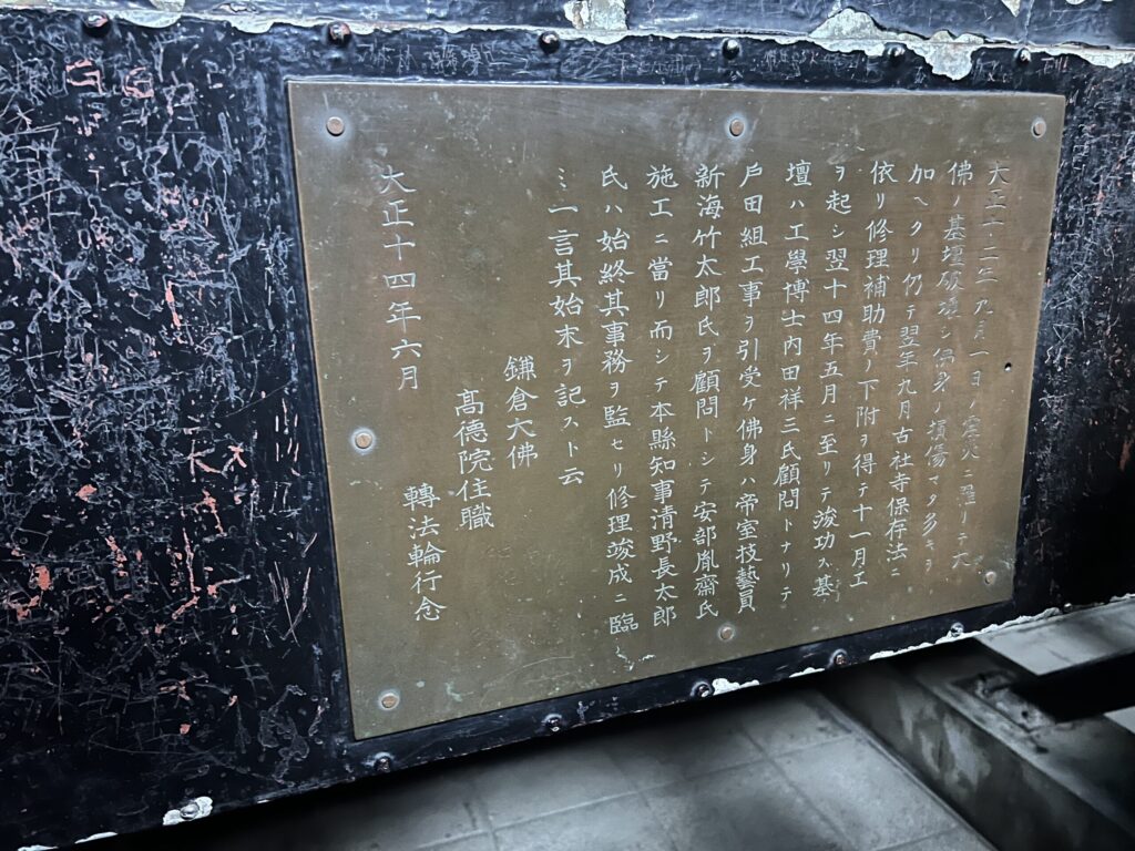 荘厳な姿は圧倒されますが、今回驚いたのは 大仏の中に入れる ということ!(50円)人がすれ違うのがギリギリな通路、階段を通り内部へ。内部は暖かく、空洞になっているのでした。内部は薄暗く20人から30人でぎっしりになるような程度のスペースです。仏像の構造を間近で見ることができる貴重な体験でした。
