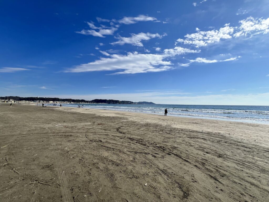 由比ガ浜では浜風が心地よく、秋晴れの空と海の青さが美しい時間でした。