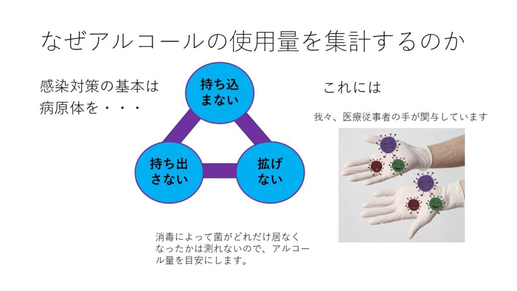 手指消毒用アルコール量を増やそう!!師長から怒られるから増やそう!!アルコール使用量を増やすのは目的はないですよね。