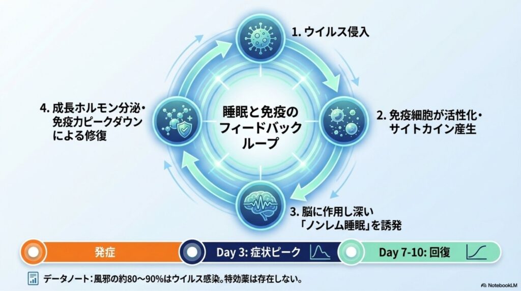 ウイルスが侵入すると、免疫細胞から「サイトカイン」という物質が放出されます。これが脳の睡眠中枢に働きかけ、深い眠りである**「ノンレム睡眠」**を誘発します。この深い眠りの間に、成長ホルモンや免疫機能を司る物質が集中的に分泌され、心身の修復が行われるのです。