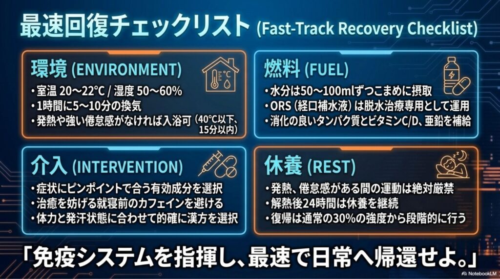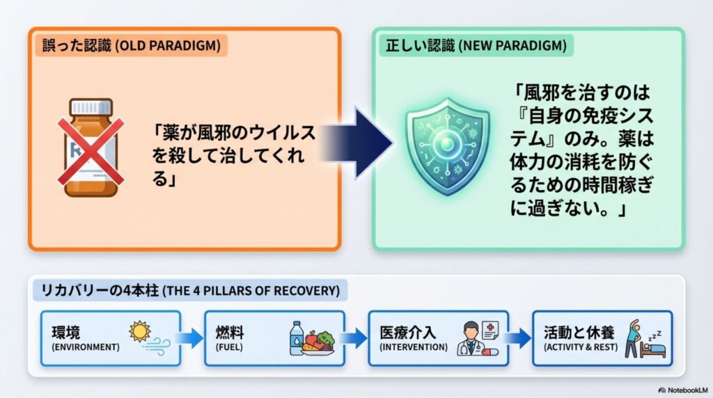 本記事では、専門的な知見に基づき、安静・栄養・環境・薬の適正使用という4つの視点から、科学的な根拠に基づいた最短の回復ルートを解説します。