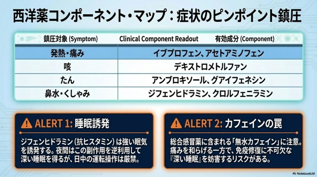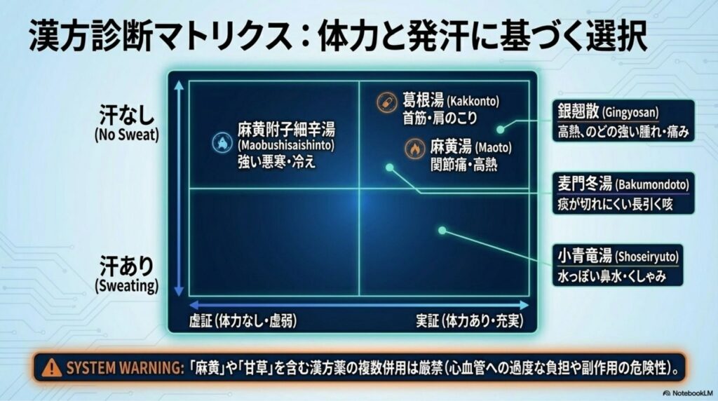 【重要:飲み合わせの警告】 多くの風邪薬や漢方薬には、交感神経に作用する**「麻黄(エフェドリン)」や、抗炎症作用のある「甘草(グリチルリチン)」**が含まれています。これらを併用すると、動悸や不眠、あるいは「偽アルドステロン症(血圧上昇やむくみ)」などの重篤な副作用を招く恐れがあります。市販の総合風邪薬と漢方薬を自己判断で併用しないでください。