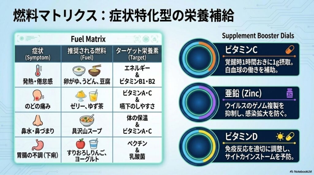 • ビタミンC + 亜鉛: この2つをセットで摂ることで、風邪の期間を短縮する相乗効果が期待できます(亜鉛の目安:10mg〜15mg)。