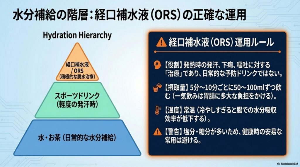 ORSは日常の水分補給用ではなく、脱水に対する**「治療ツール」**です。