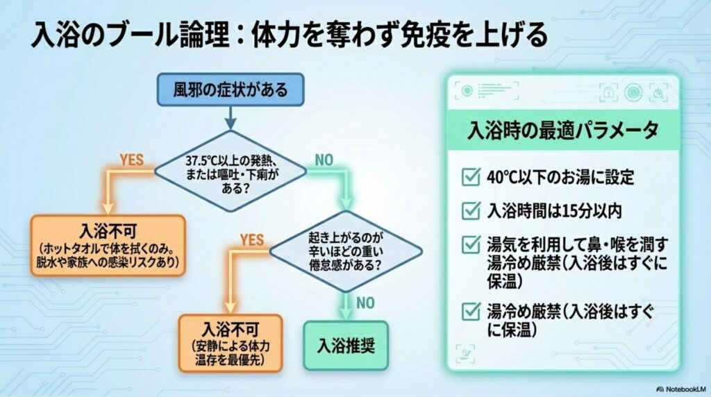 • 家庭内感染防止: 風邪をひいている人は、タオルや桶の共有を避け、**「家族の中で最後に入る」**のが鉄則です。