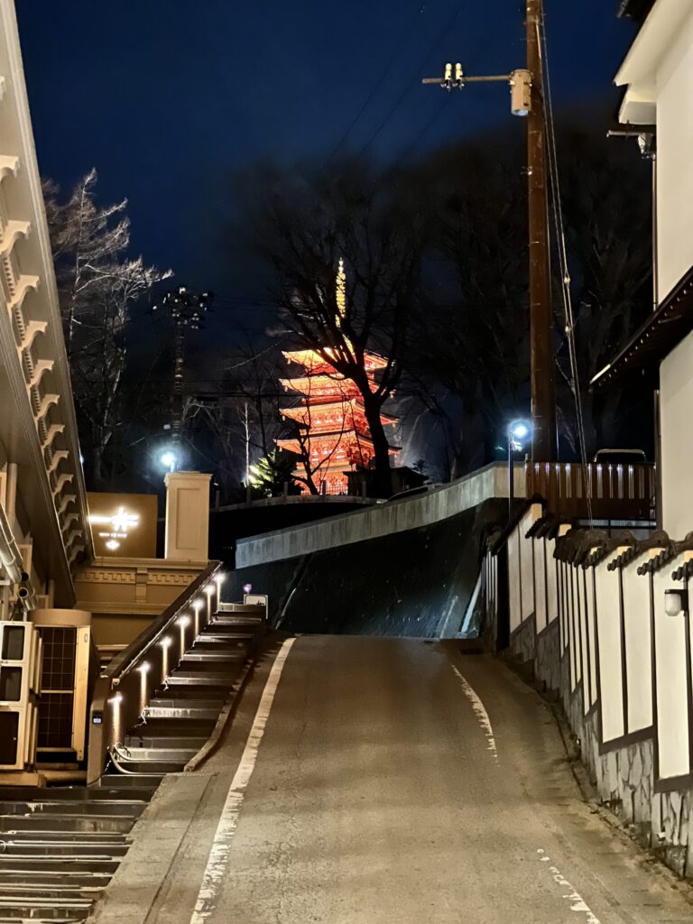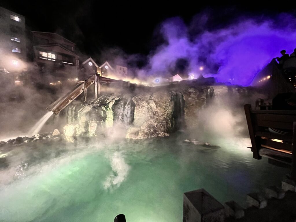 夜の湯畑はライトアップされていて、昼とは別の顔。